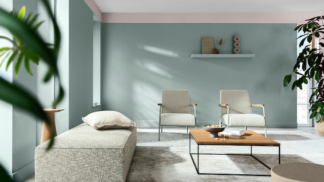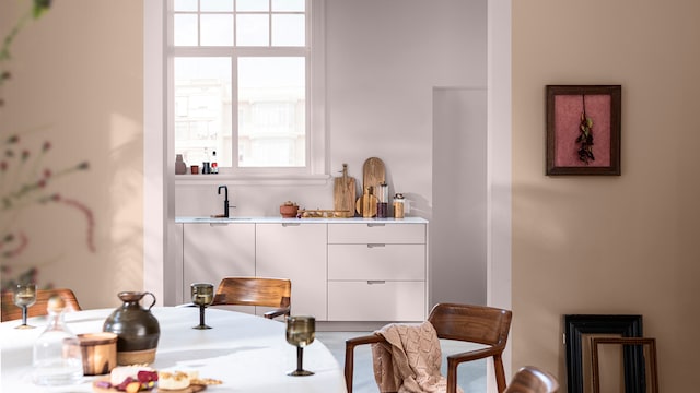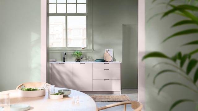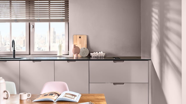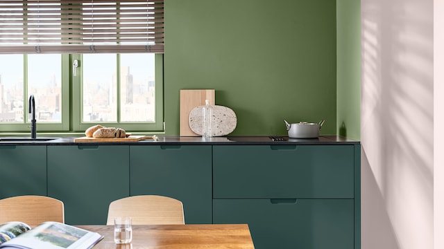 Met de juiste kleuren kan zelfs een drukke keuken rustgevend aanvoelen. Ons kalme kleurverhaal is samengesteld met natuurlijke groen- en blauwtinten die een ruimte een rustige en soepele uitstraling geven. Hier zetten twee donkergroene tinten de toon en voegt Sweet Embrace™ warmte toe.