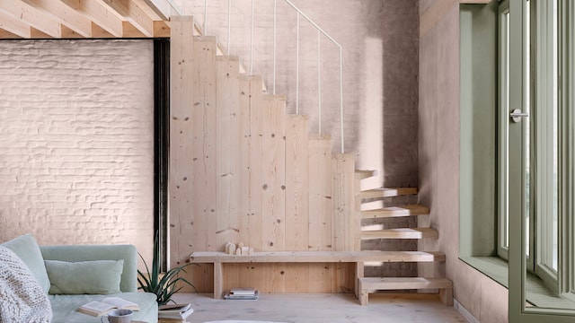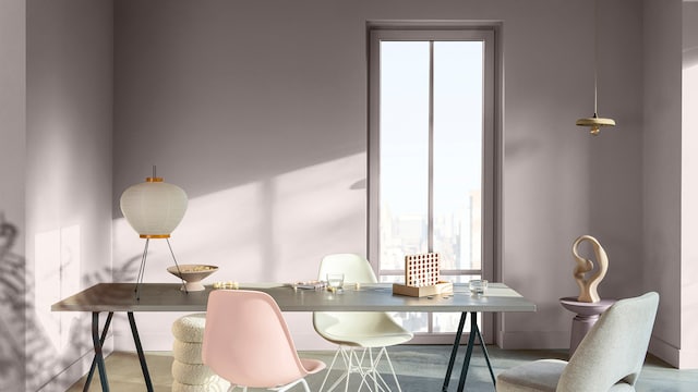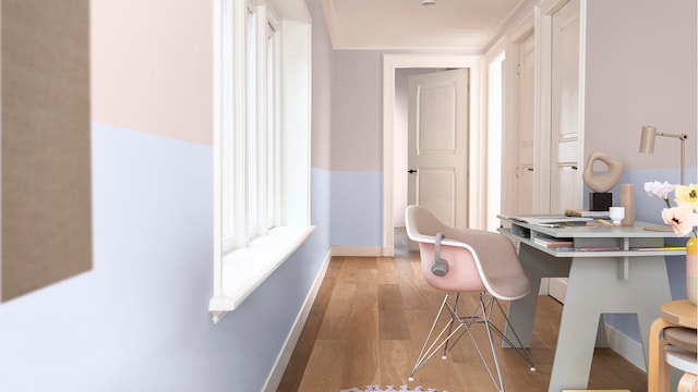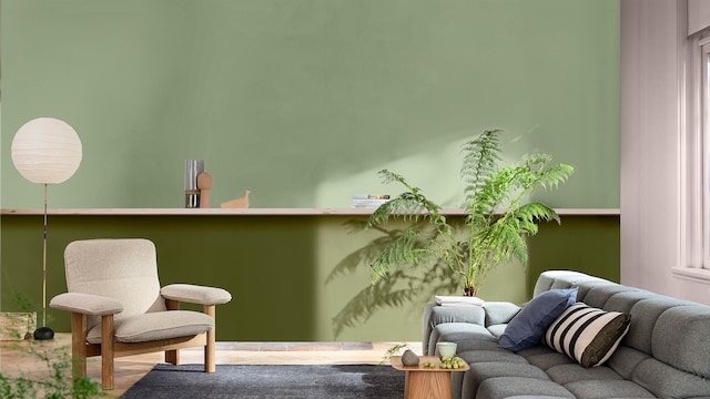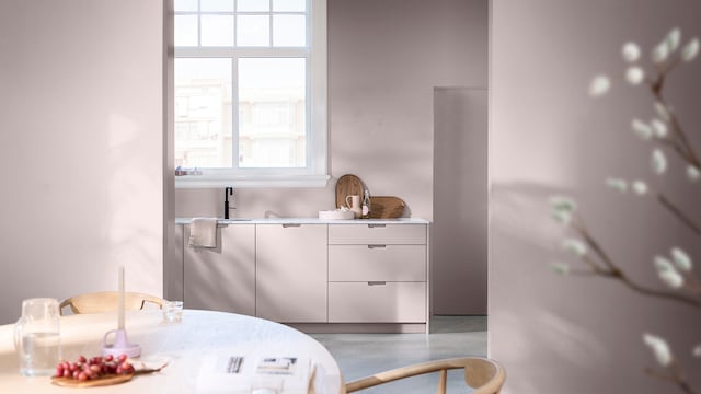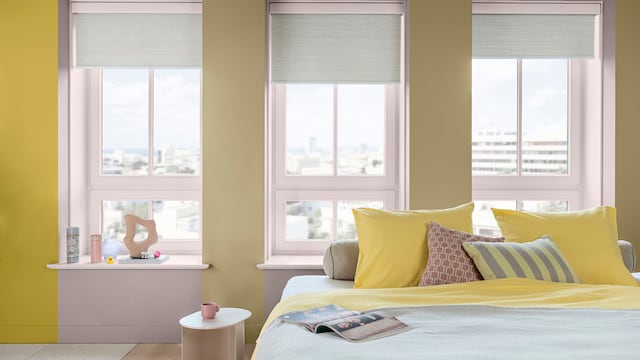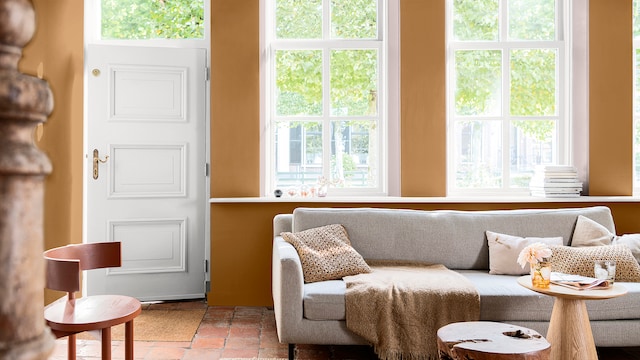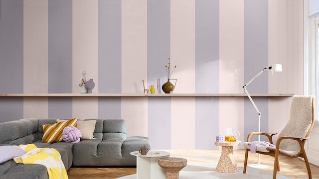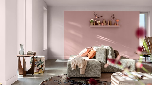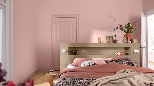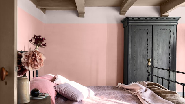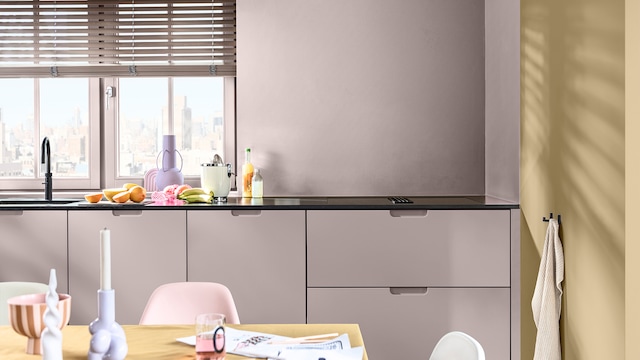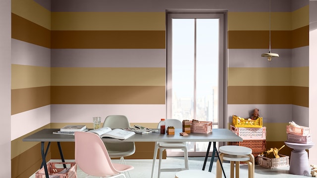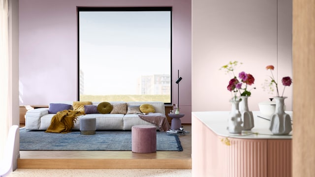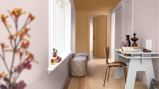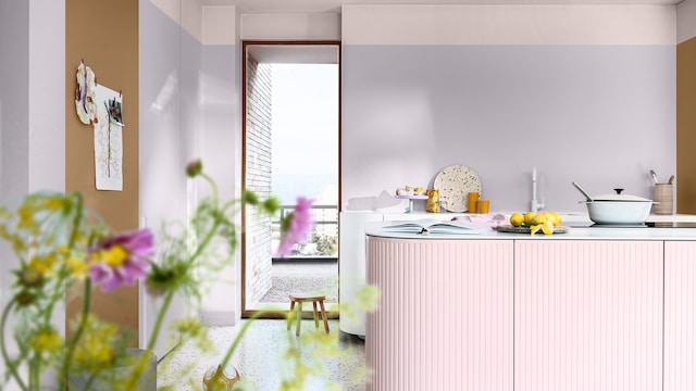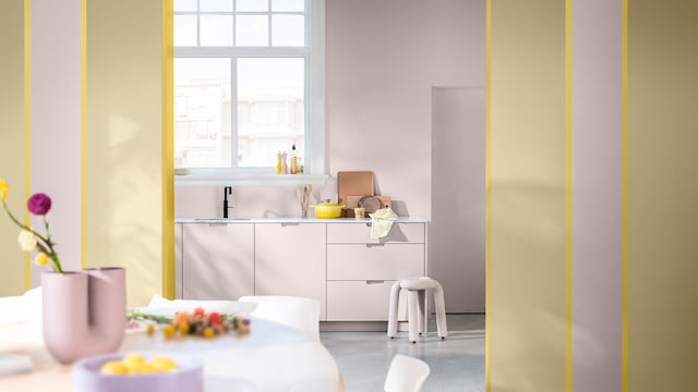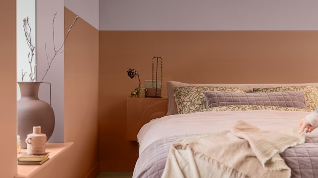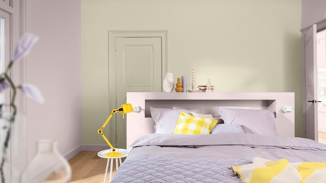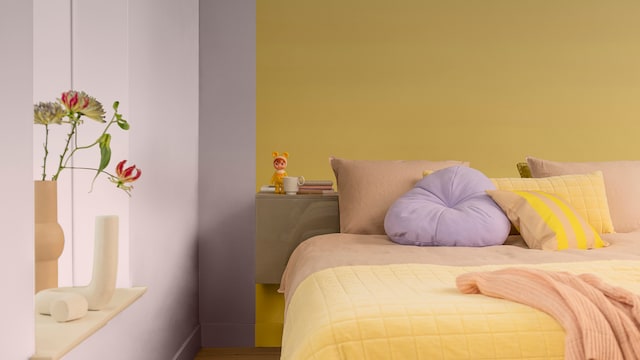 Door het mengen van dromerige lila- en geeltinten creëert ons vrolijke kleurverhaal een plezierige en vriendelijke achtergrond, zonder een kamer te overheersen. Hier zorgt zacht oker met als achtergrond Sweet Embrace™, de Kleur van het Jaar 2024, voor wat extra warmte in het slaapgedeelte.