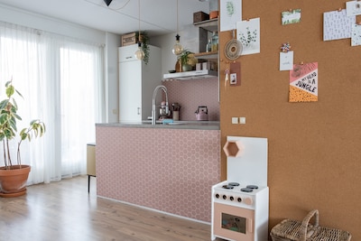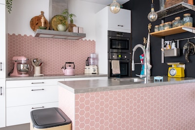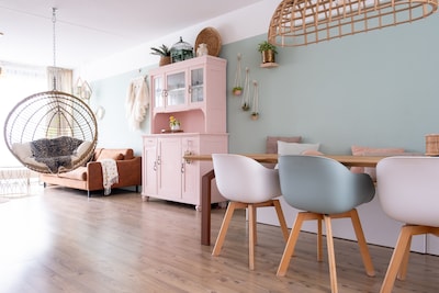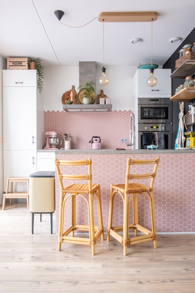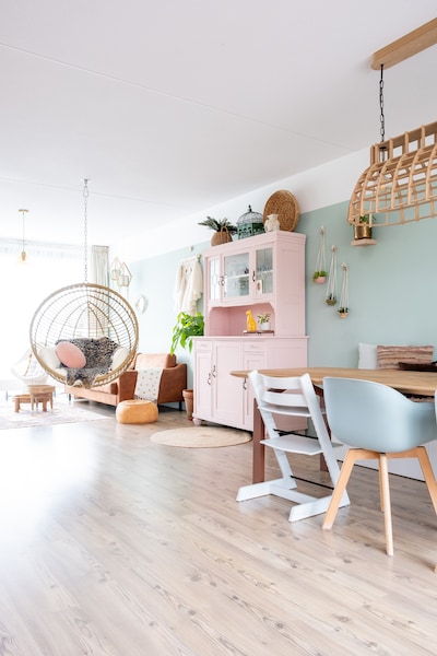 Ik voel mij thuis in een kleurrijk huis. Niet te bont, maar ik omring mij wel graag met subtiele kleurtinten. Het liefst voeg ik in iedere ruimte wel wat roze toe, want daar word ik heel blij van. Helaas denken de 2 grootste mannen in dit gezin daar anders over.