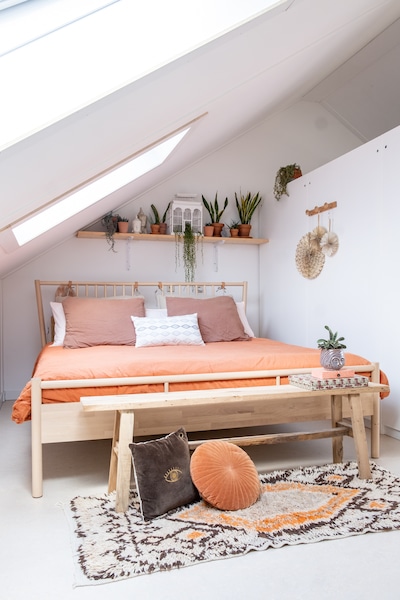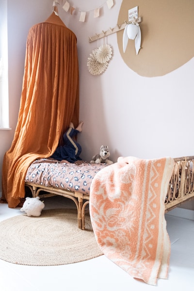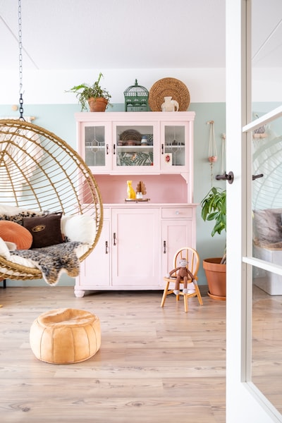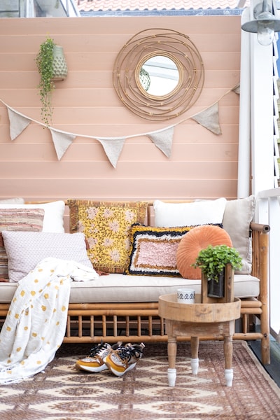 Onze veranda is dan ook mijn favoriete ruimte bij onze woning. Omdat ik hier omringd ben door mijn lievelingskleur een peach-achtig roze die de naam Flexa Humble Blush draagt. Deze kleur vind ik wel passen bij de tropische en bohemian vibes waar ik zo van houd. Het past perfect bij natuurlijke materialen, maar ook bij mijn vintage kringloopvondsten, zoals het vloerkleed en het wandrek.