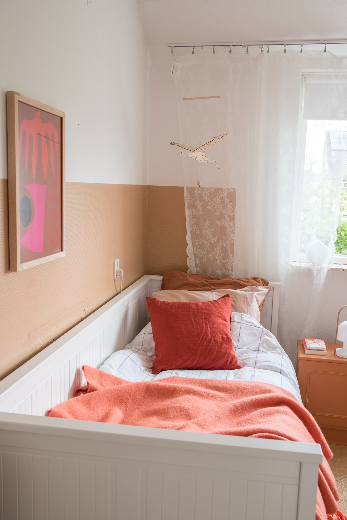 Mijn favoriete plek in huis is nu de slaapkamer. Ik ben helemaal weg van de kleurencombinatie lila met oranje. Het beddengoed, de Scandinavische stoeltjes en de posters komen beter tot hun recht. Het klopt en daar word ik weer rustig van.