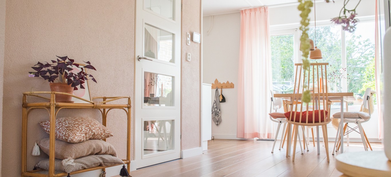 Ons huis is licht, denk aan lichte kleuren op de muren van een lila kleur Iets Heide tot een grijze Silver Shadow. Bijna allemaal gecombineerd met blank hout en een frisse basis. Ik hou van planten, maar bloemen zijn mijn favoriet, ze maken mij vrolijk en tillen mijn huis naar een hoger niveau. Favoriete bloemen zijn Gladiolen, Pioenrozen, Franse Tulpen, Papaver en een weelderig veldboeket. Ons interieur is vrouwelijk, dat komt door o.a. de bloemen en roze touch. Roze gordijnen, roze badkamertegeltjes en roze accessoires gecombineerd met goede basics maar niet te ‘popperig’.